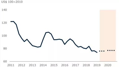 根據(jù)世界銀行的預測,飲料價格指數(shù)在2019年下降5%之后,預計2020年將上升2%。世界銀行在11月將飲料價格的經(jīng)濟預測進行了上調(diào),并預測下降趨勢將在2020年穩(wěn)定下來。世界銀行飲料指數(shù)